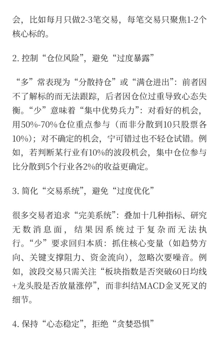 - 限制标的数量:同时跟踪≤3个板块、≤5只股票,深入研究其基本面/技术面(做到知根知底)。