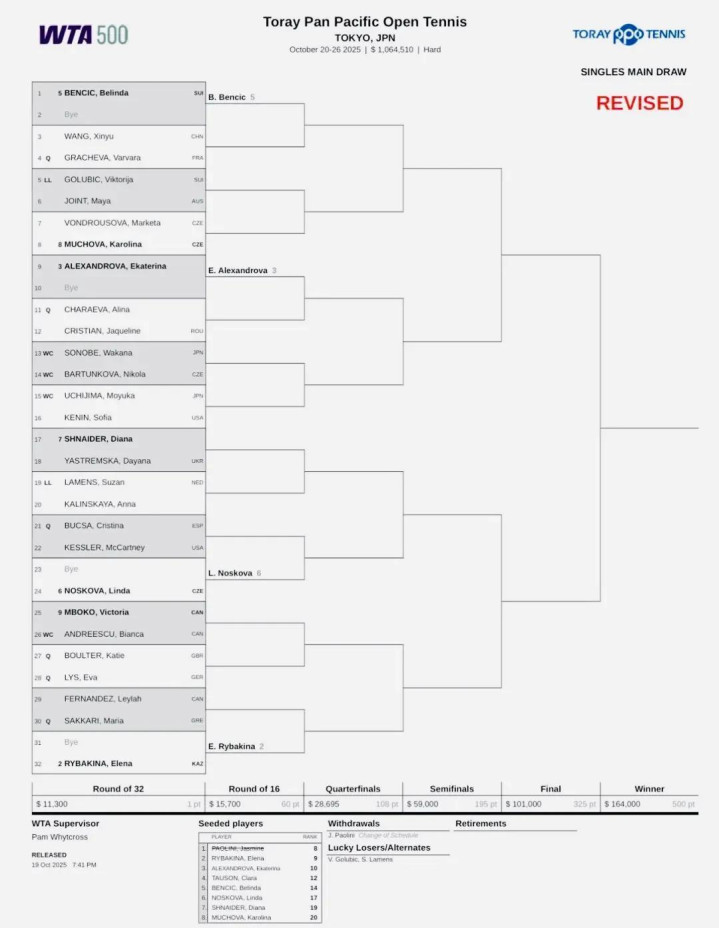 按照此前签表,格拉切娃原本第二轮将迎战首轮轮空的头号种子鲍里妮,但由于已经拿到WTA年终总决赛门票的鲍里妮昨日选择退赛,格拉切娃第二轮的对手就将变成5号种子本西奇,后者在宁波站经历了两场三个多小时的鏖战后,在女单1/4决赛1-2不敌鲍里妮,无缘宁波站女单四强。