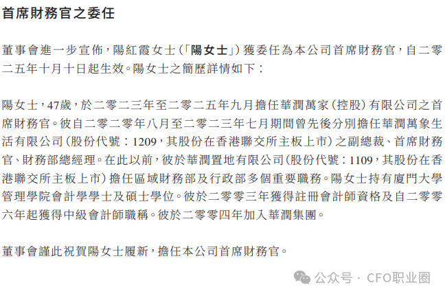 阳红霞女士,47岁,于二零二三年至二零二五年九月担任华润万家(控股)有限公司之首席财务官。彼自二零二零年八月至二零二三年七月期间曾先后分别担任华润万象生活有限公司(股分代号:1209,其股分在香港联交所主板上市)之副总裁、首席财务官、财务部总经理。在此以前,彼于华润置地有限公司(股分代号:1109,其股分在香港联交所主板上市)担任区域财务部及行政部多个重要职务。