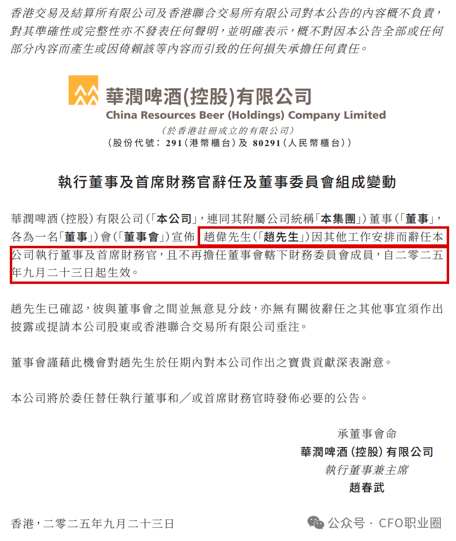 而在9月23日,华润啤酒宣布,赵伟先生因其他工作安排而辞任该公司执行董事及首席财务官。同日,港股上市公司华润置地(01109.HK)宣布,赵伟先生获委任为执行董事、执行委员会成员、首席财务官、董事会秘书及授权代表。详见《华润啤酒和华润置地同日宣布变更CFO!》。